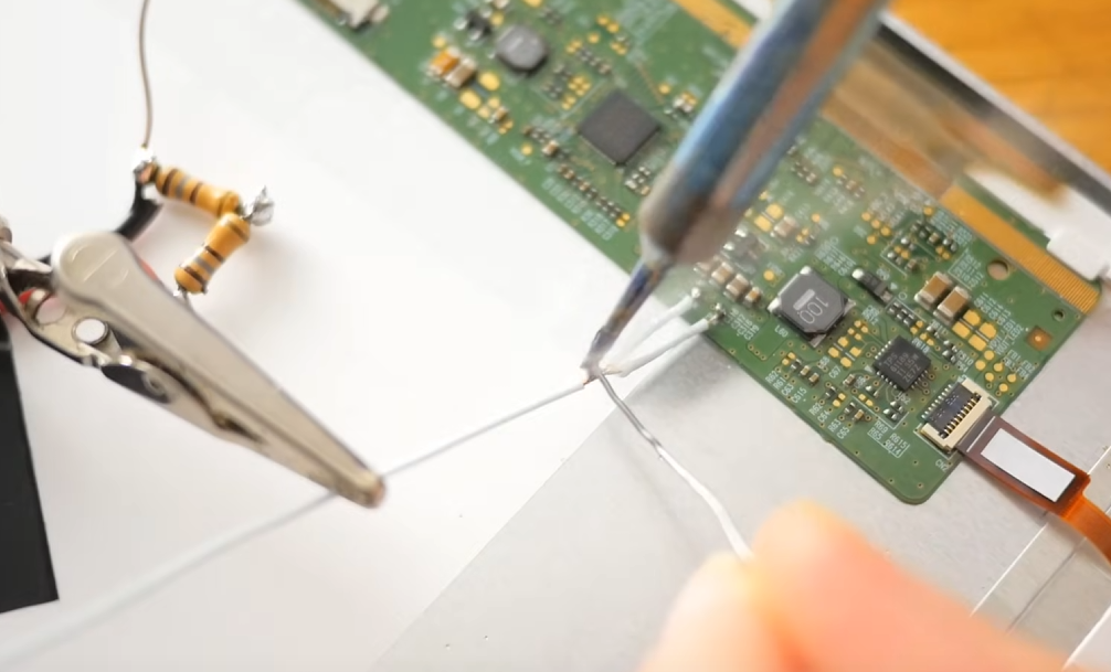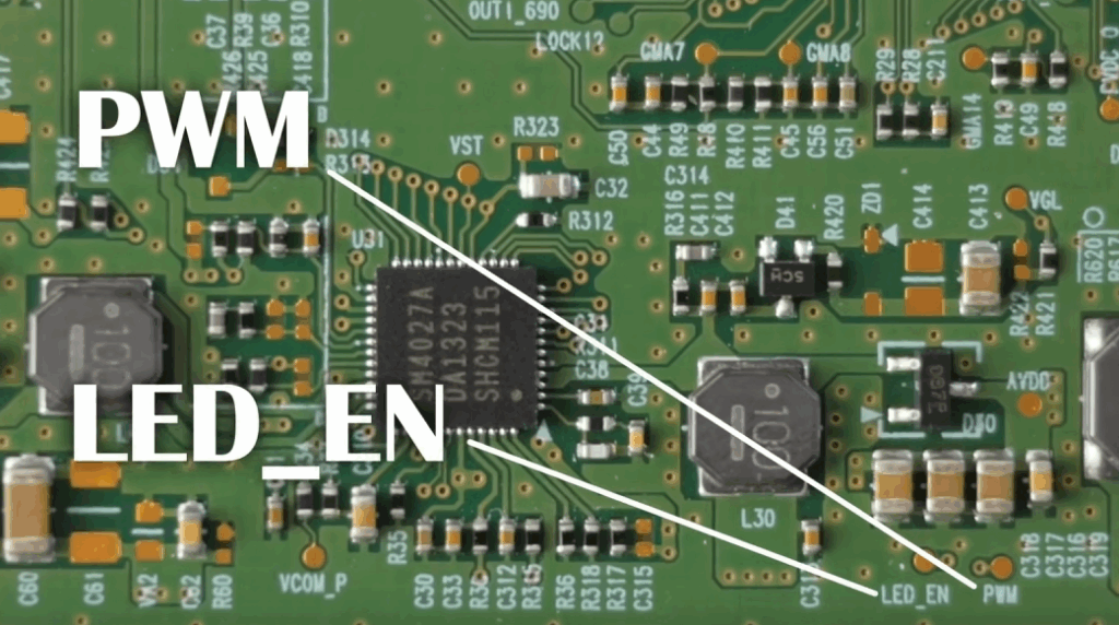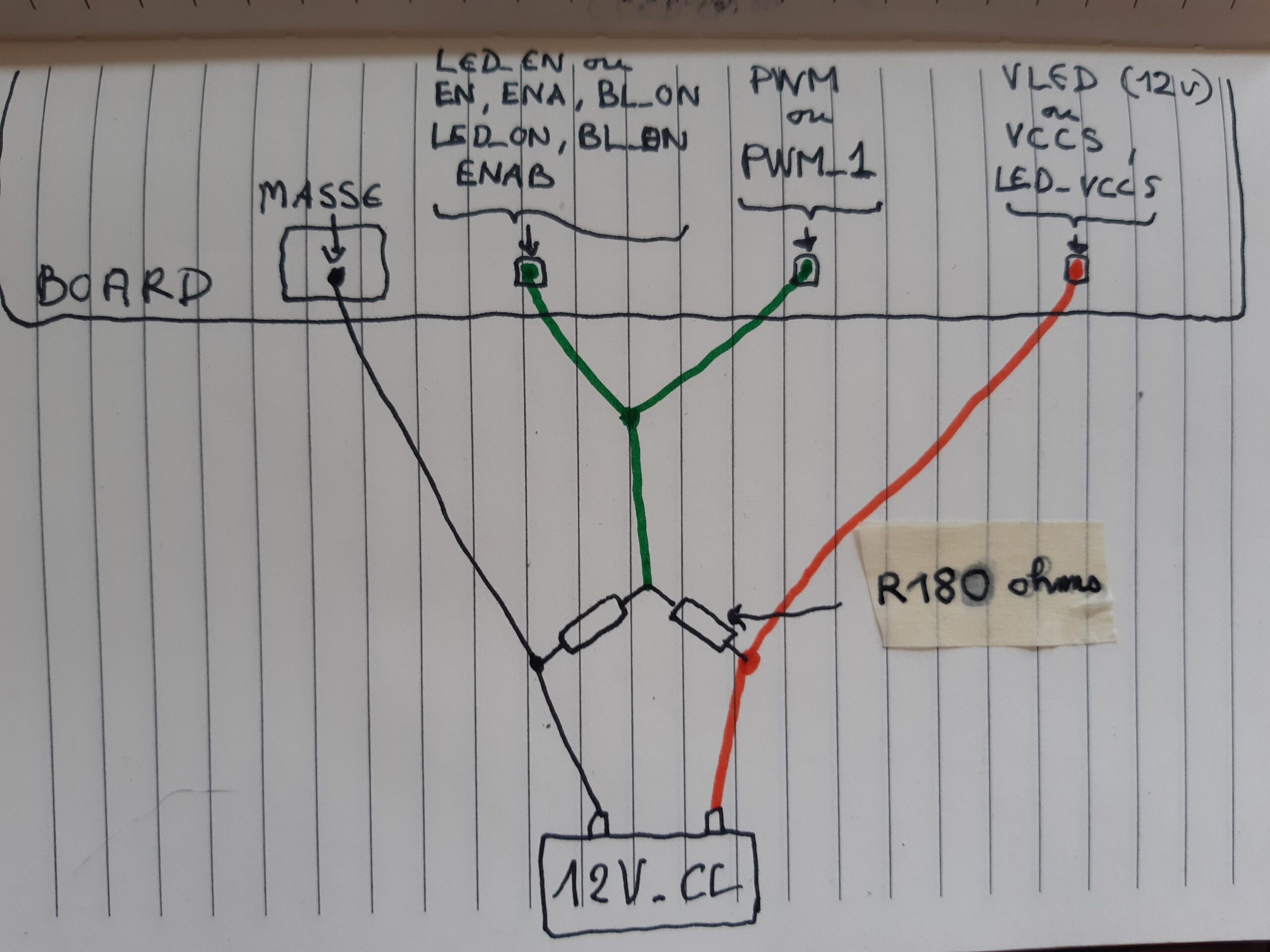 souder la jonction des 2 resistances à Pwm (ou PWM_1) ET à Led_en (ou EN, ENA, BL_ON, LEDON, BL_EN, or ENAB)